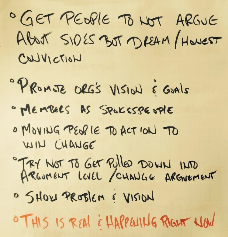 We worked (with Chorus, MACED, and KFTC to come to a better understanding of just transition work and the best ways to talk about it. We used a lot of easel paper and sticky notes.